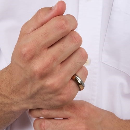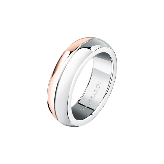 Кольцо изготовлено из высококачественной нержавеющей стали, что обеспечивает его прочность, устойчивость к коррозии и долговечность. Центральным элементом дизайна является биколорное исполнение.